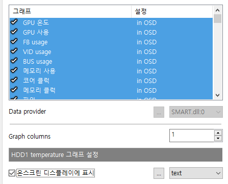 그다음 하드웨어 모니터링을 사용할 그래프 선택 부분에서 노출하실 항목을 선택 후 아래 온스크린 디스플레이에 표시 버튼을 눌러 주시면 선택한 항목의 설정 부분에 "in OSD"라고 표시되는 것을 확인할 수 있으며 이렇게 표시되면 정상적으로 적용된다고 보시면 됩니다. 참고로 Ctrl 버튼을 누른 채로 여러 개 선택 후에 온스크린 디스플레이에 표시 버튼을 누르면 한 번에 여러 개가 적용된답니다!
